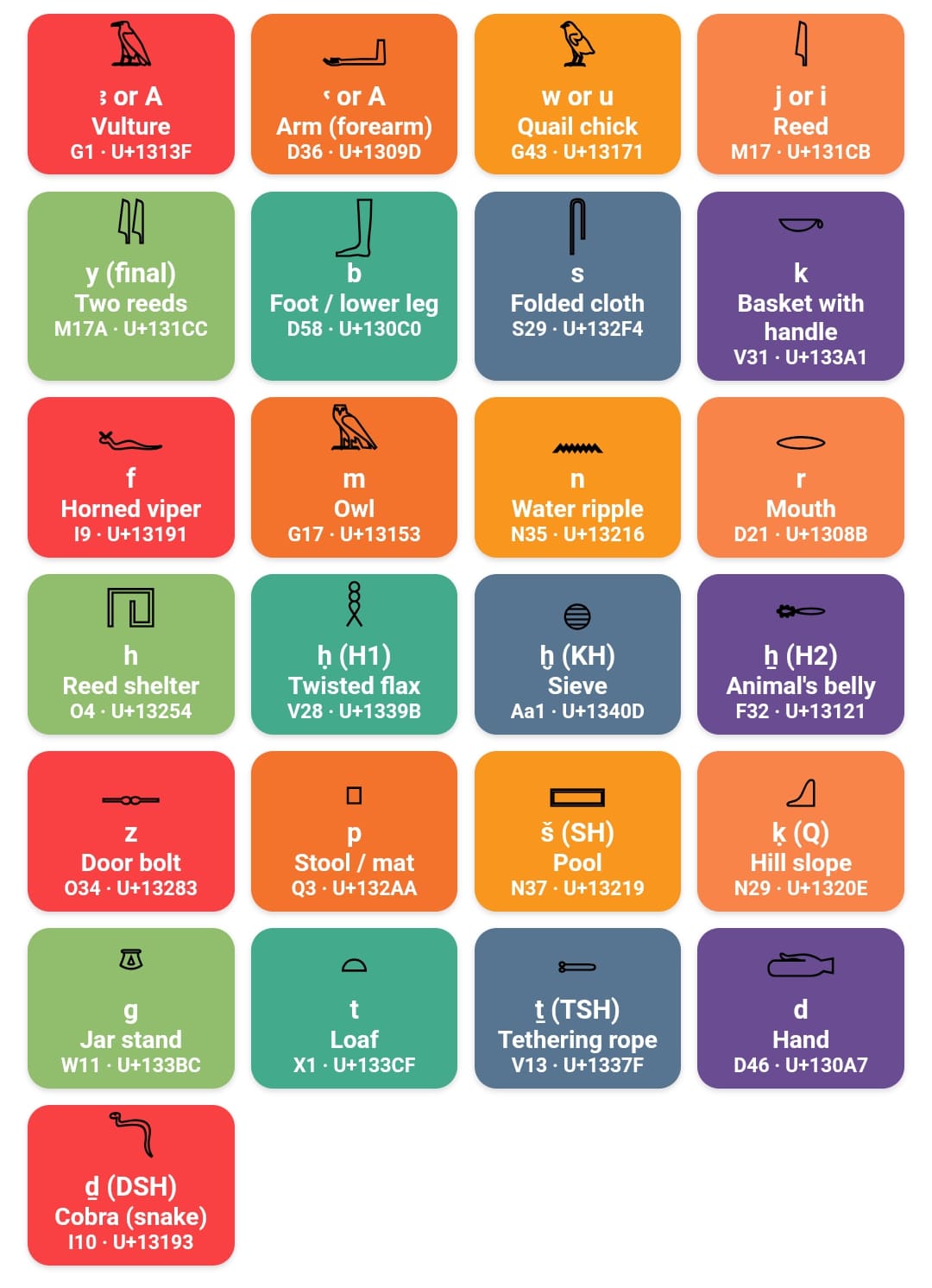 Uniliteral Signs: Represent a single consonant sound. Example: 𓄿 (ꜣ, a glottal stop, often approximated as "a").