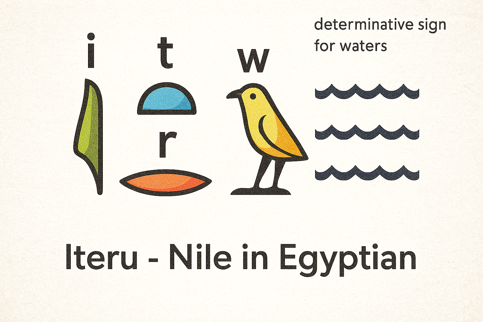Another example is the word for "Nile," 𓇋𓏏𓂋𓅱𓈗, transliterated as "iteru," where 𓇋𓏏𓂋𓅱 represents the phonetic elements for "i-t-r-w," and 𓈗 is a determinative for "water," indicating the word relates to a river or liquid.